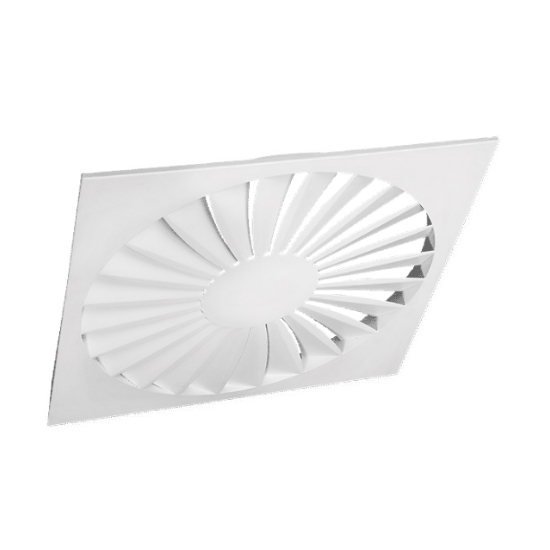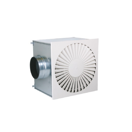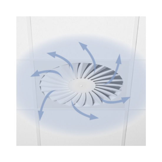 The Turbulance Diffuser  produces a high induction radial swirl pattern which promotes rapid temperatureequalization and is suitable for VAV applications where high turndown is present. This product can be installed in standard 24 in. x 24 in - 595x595mm. lay-in ceiling grids or surface mounted using a plaster frame.